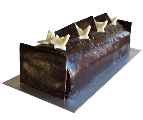 Chocolate sponge with caramel whipped cream, bittersweet chocolate glaze, gold dusted chocolate leaves and tiles.