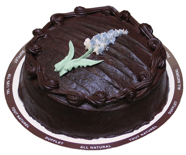 Single layer sour cream chocolate cake with bittersweet chocolate icing with a purple hyacinth decoration.