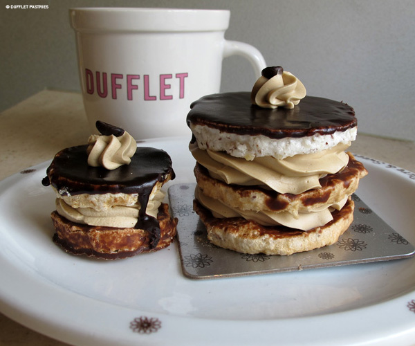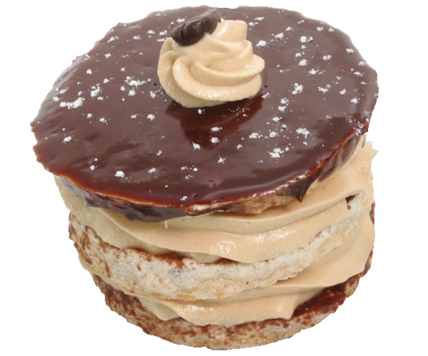 Crunchy hazelnut meringue layered with coffee buttercream; finished with a dark chocolate glaze.