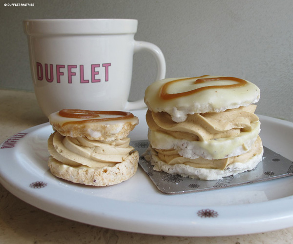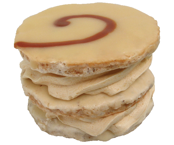 Crunchy hazelnut meringue layered with caramel buttercream; finished with a white chocolate glaze and a caramel swirl.