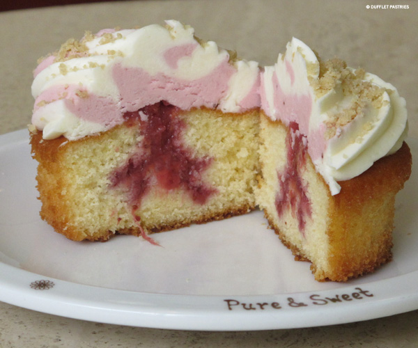 Golden vanilla cake filled with strawberry compote, topped with vanilla and strawberry swirled buttercream; garnished with shortcake crumbs.