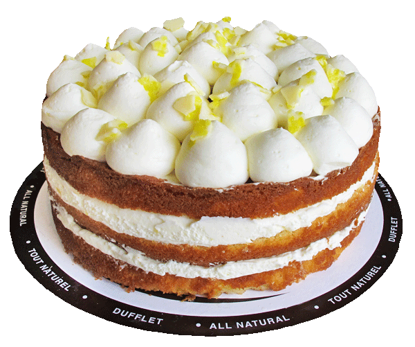 Lemon mousse and classic vanilla cake layered together, topped with whipped cream.