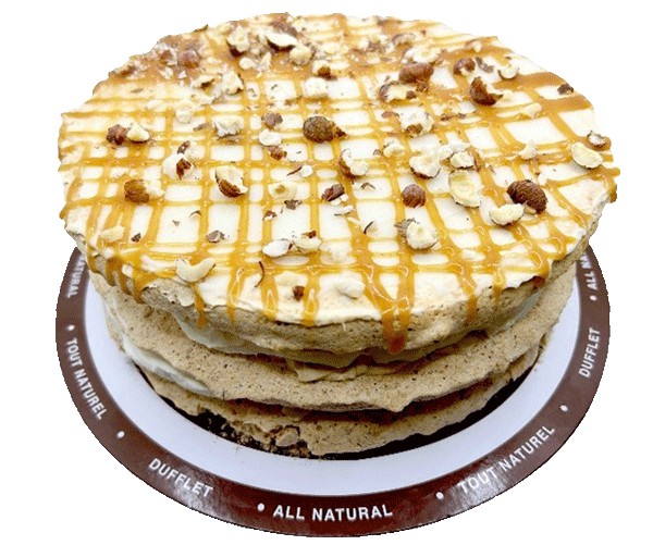 Our famous Nutt-e® Toffee Torte! Layers of hazelnut meringue, fresh whipped cream and buttery caramel finished with white chocolate glaze, French caramel drizzle and crushed hazelnuts.