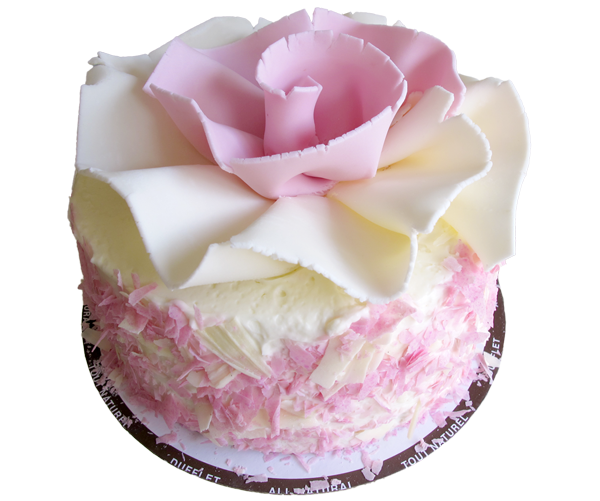 Classic white sponge cake layered with white chocolate mousse and a touch of strawberry compote; topped with a pink chocolate ruffle.