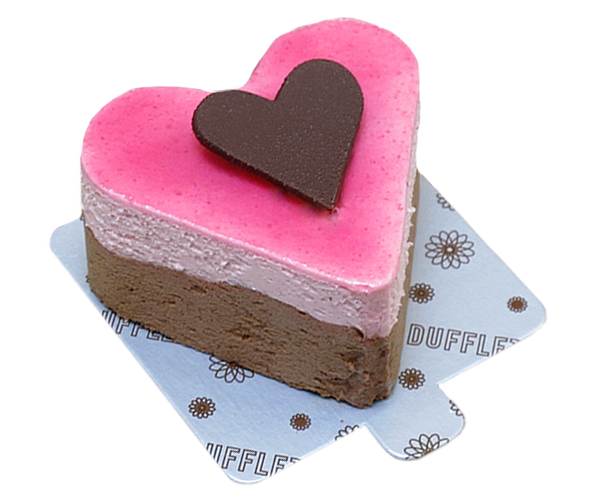 Layers of raspberry and chocolate mousse around a chocolate biscuit, finished with red mirror glaze and a dark chocolate heart.