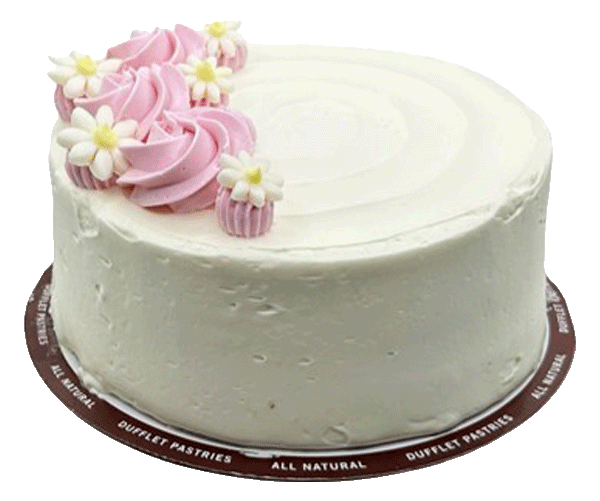 Classic single layered vanilla cake with vanilla bean mousse; iced with vanilla buttercream then topped with flowers; finished with a white buttercream.