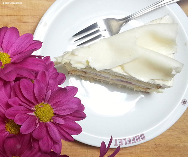 Classic white sponge cake layered with white chocolate mousse and a touch of strawberry compote; topped with a white chocolate ruffle.